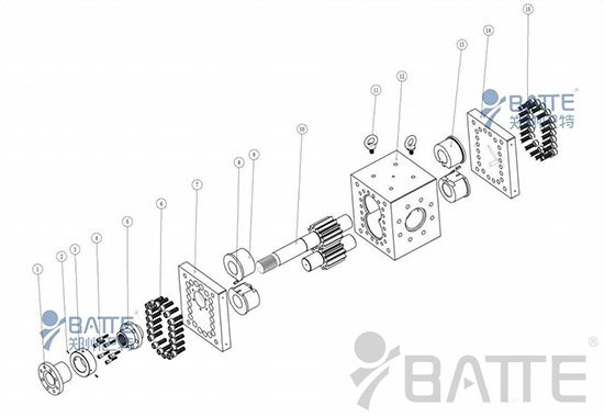 熔體泵結(jié)構(gòu)主要由泵體、主動(dòng)齒輪和從動(dòng)齒輪、滑動(dòng)軸承、前后端板、填料密封等部件組成,被廣泛應(yīng)用于塑料、樹脂、橡膠、化纖制品的擠出成型。